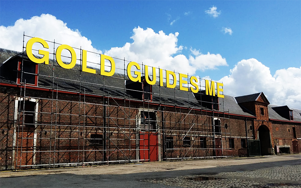 The art work I have created for Triennale Brugge as part of my research project Capitalism in the Public Relam, consists of a 3D LED sentence signage placed on the roof of the historic Gistfabriek. The statement, Gold Guides Me, is a word play on religion, the history of finance, ethics and notions of greed, questioning social-political financial value systems and the economy of advertisement. The reference to societal guidance can be seen in the word Gold, as interchangeable with God. In the sentence referring to God, we are asked to trust a higher power, as citizens under the structure of hierarchy and as subjects. By exchanging God into Gold, the idea of the inner societal compass, spiritual values and obedience is replaced with a fetishism of ownership, power and wealth, future transfigurations in free market competition and dependence, and personal liberation and satisfaction.