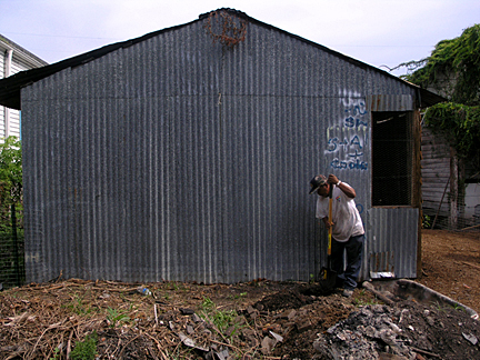Project title: The Urban Sugarcane Plantation, 2009. An Agricultural Urban Land Project. Sugracane plantlets are planetd in streets, low income neighborhoods and backyards where they would naturally grow prior to the current city structure of New Orleans and as an effort to bring agriculture to increase sustainability to local people. Sugarcane has soil binding and soil purifying properties, in addition to providing juice, sugar and fuel. May 2009 Location: KK Projects, N Villiere St, A Site,Time, Situation Specific Agricultural Land Art installation, in collaboration with Ronnie Waguespack JR and KK Projects, With collaborative support from: